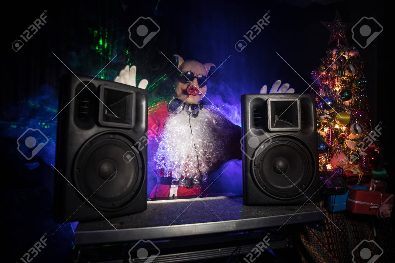 Pig Concept. Dj Santa With Pig Mask dj box 2019